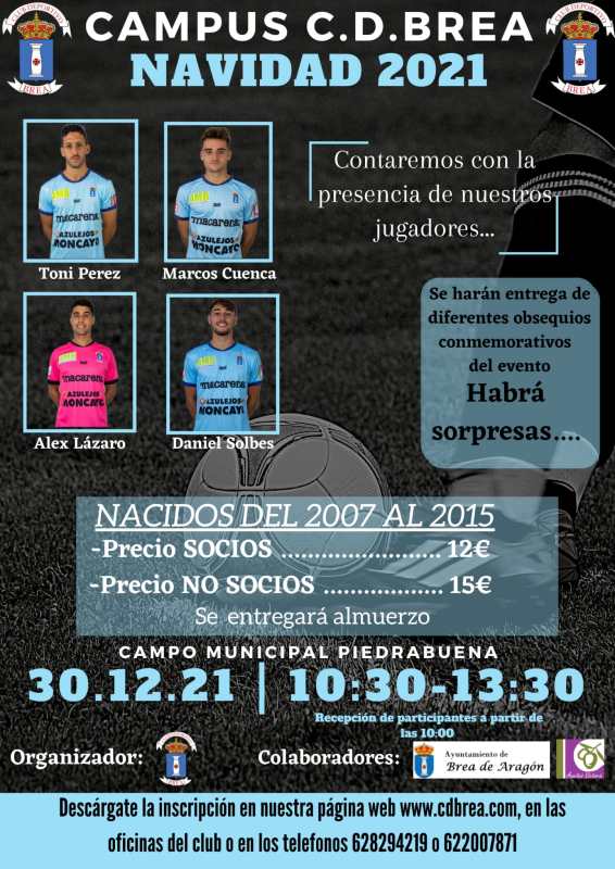 El CD Brea celebrará el próximo jueves 30 de diciembre de 10:30 a 13:30 su Campus de Navidad 2021 dirigido a los nacidos entre los años 2007 y 2015. Las distintas actividades se realizarán en el Campo Municipal de Piedrabuena, donde se realizará la recepción de los participantes a partir de las 10:00. Contará con la presencia de varios jugadores de la plantilla, se entregarán distintos obsequios conmemorativos, habrá almuerzo y muchas más sorpresas.