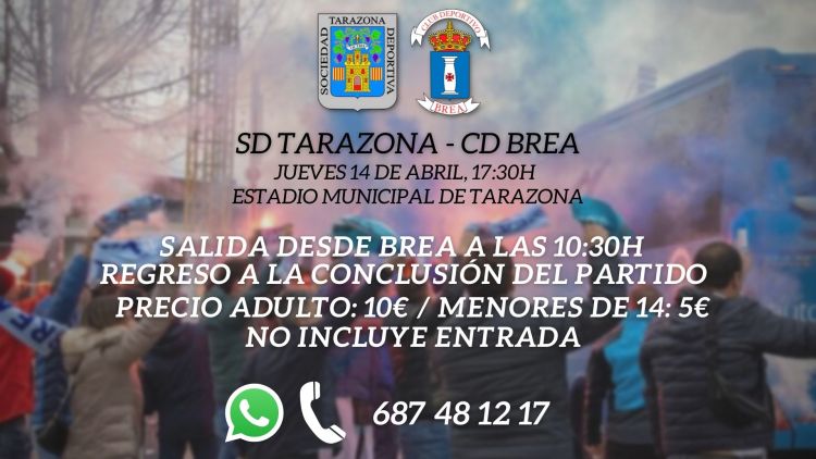 La salida de los autobuses desde Brea de Aragón tendrá lugar a las 10:30h del jueves y se regresará a Brea una vez concluido el encuentro. Tanto para los socios del club, como para los no socios, el viaje tendrá un precio de 10€ para adultos y de 5€ para menores de 14 años. Todo aquel que esté interesado deberá notificarlo al teléfono del club: 687 48 12 17